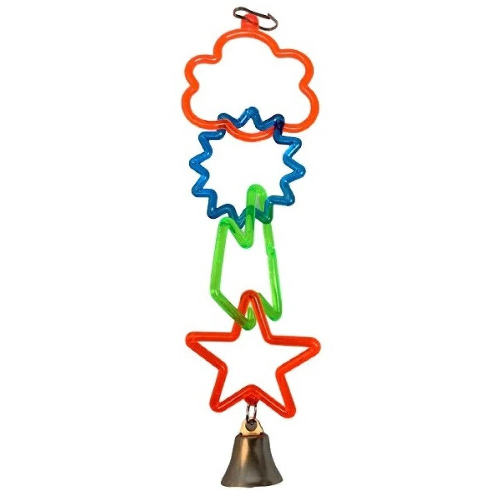 Plastová, barevná hračka se zvonečkem pro ptáky k zavěšení do klece.
